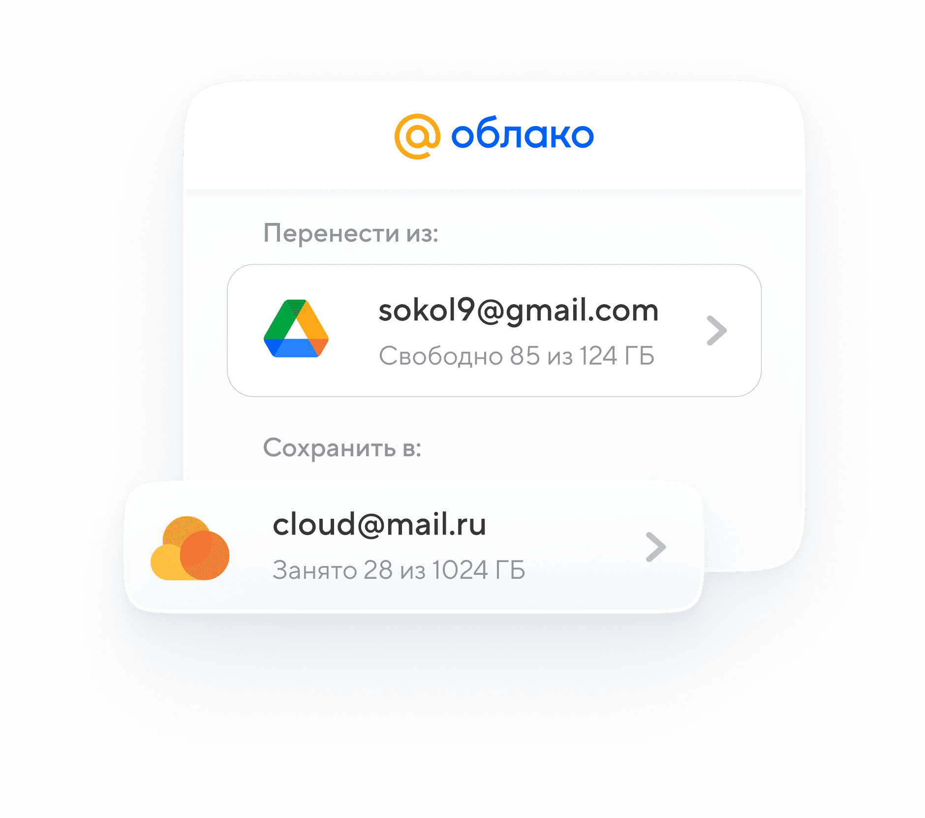 В новом приложении Облака для компьютера можно легко перенести файлы из Google Диска и других зарубежных хранилищ в Облако Mail.ru. Доступ к файлам не потеряется, ведь Облако точно не уйдёт из России.